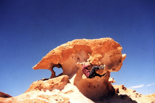 A weird rock in the desert, with a chap called Chris enjoying a spot of simian tomfoolery.