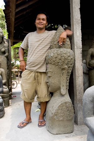 | When 'scoring' souvenirs it pays to think big. For while any fool can take home an ethic knick-knack from Bali, it takes a pretty full-on fool to ship a 400kg stone head back. On the left is the chap who carved the head; on the right, my younger brother, Grant who helped move it. Eagle eyed viewers will note that Grant is wearing unnaturally high cut shorts: they're sort of a trademark of his. |