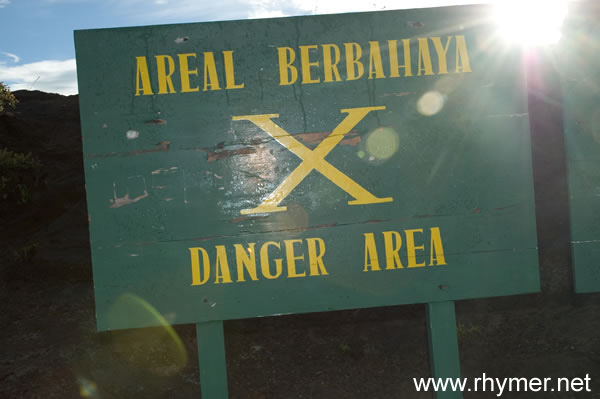 | Unbeknownst to many historians, Malcolm X survived the 1965 assasination attempt and moved to Flores to regroup and purify the Nation of Islam. Alas, as there was already plenty of the regular kind of Islam around he was wasting his time, although his legacy lives on in a shy hill tribe who occasionally put on dinner jackets and bow ties. In 1987, they erected this sign is in his memory. Kelimutu Volcano, Flores, Indonesia, 2005 |