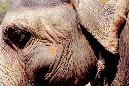 For an age I just stood there, marvelling at the interplay of light and shade on the elephant's remarkable skin, its creases as ancient and eternal as the folded surface of the earth itself. From time to time, it did occur to me that it was just an ordinary elephant; when this happened I knew it was time to take another hit on the chillum pipe. Rajastan, India 2002 |