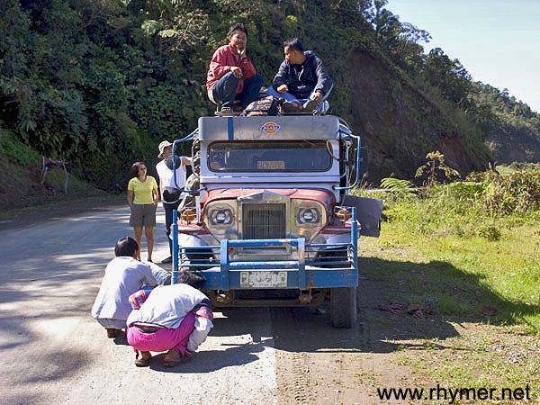 When your Jeepeny breaks down, there's not much to do except stand around looking utterly useless waiting for someone who doesn't work in the 'knowledge economy' to fix it. nr. Bontoc, Luzon ,Philippines 2004