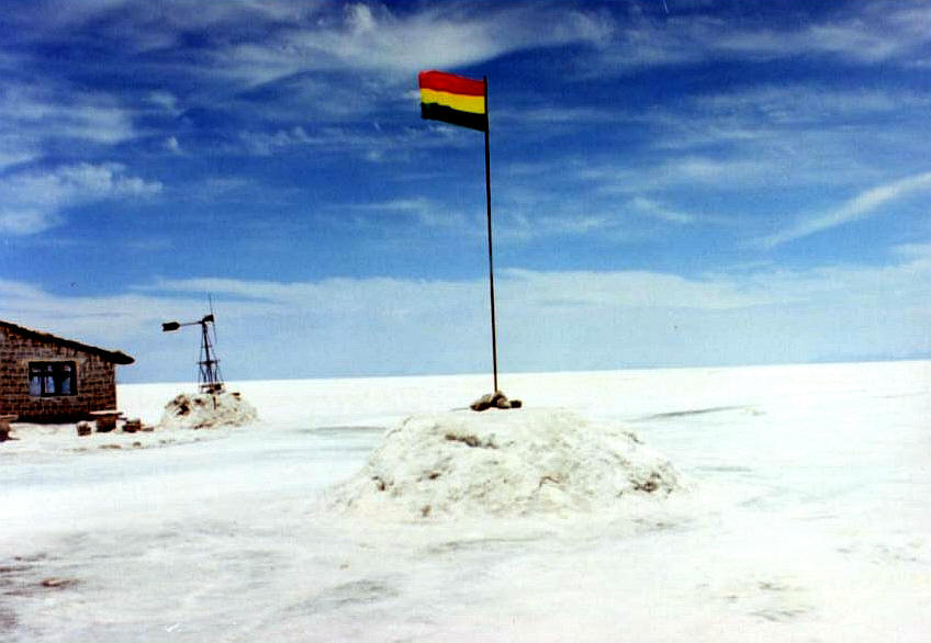 When I first saw this standard fluttering above the Salar, I thought I had found a far flung Rasta outpost. Disappointingly, though, the Bolivian flag shares its colours with every student's favourite religion. Bolivia, 2002. |