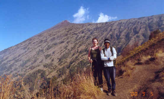 Jane and Sunni, our guide, below the summit, Mt Rinjani; sadly hoodlums have defiled this holy mountain by spraying their stylised digital 'tag' at the bottom right.