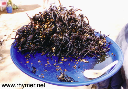 The record for eating spiders is an astonishing 127 in 3 minutes; in the same time I managed a creditable (for a westerner 37.5). Later that day, I would start to feel queasy and attempt to spin a web on the toilet.